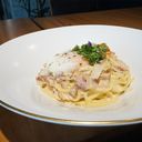 Pasta cooked in cream sauce with generous amount of turkey bacon