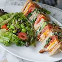 Toasted turkish bread, bacon, chicken, fried egg, cheddar, creamed spinach, tomato relish, gherkins and mesclun salad