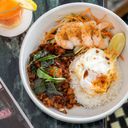 Wok-fried basil chicken, fresh prawn salad, sunny-side-up egg, jasmine rice and toasted coconut flakes