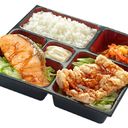 A Japanese bento box featuring fried shrimp and crispy marinated chicken, perfect for lunch.