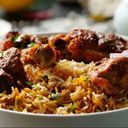 A fragrant rice dish with tender meat, spices, and aromatic herbs, slow-cooked to perfection.