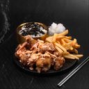 Succulent boneless chicken karaage drizzled with smoked tongarashi mikan sauce, featuring a citrus-infused flavor profile - a unique twist on classic. Served over a bed of japanese white rice, adorned with wakame and pink ginger for a refreshing touch, finishing with a sprinkle of furikake.