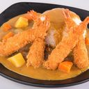 A delicious dish of crispy fried shrimp, fragrant curry sauce, and fluffy rice.
