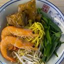 A flavorful noodle soup with succulent prawns and aromatic broth, garnished with fresh herbs.
