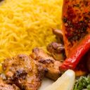 Grilled marinated chicken breast cubes served with saffron rice, grilled vegetables, babas and spicy bread.