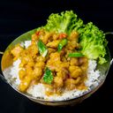 Crispy chicken cubes coated in crunchy cereal, served over fluffy rice. Delightfully savory and satisfying.