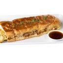Brioche bun, pulled beef dipped in nacho cheese, shredded lettuce caramelised onions, capsicums & fries.