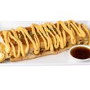 Tuna chunks, mozzarella cheese, caramelised capsicums, onions, spicy mayonnaise in a flat tortilla. Comes with cajun flavoured potato chips