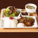 Marinated pork slices with fragrant ginger sauce, served with rice, salad, soup & pickles