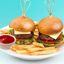 Two mini burgers with beef patties, melted cheese, lettuce, tomato, caramelised onions, pickles, premium burger sauce on a toasted bun. Served with a side of chips & tomato sauce
