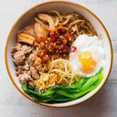 Chicken, anchovies stock savory noodle topped with fresh greens, egg & crunch toppings