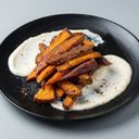Tender, grilled meat with a savory seasoning, served with a side of vegetables.