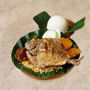 Smashed Fried Pomfret Set with Rice. Traditional Herbs & Lime-marinated whole Pomfret deep-fried to a perfect crisp. Served with Tofu, Tempeh, Side Vegetables, Crispy Golden Crumbs and our Signature Chilli.