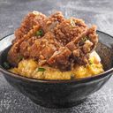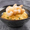 Fluffy scrambled egg rice bowl topped with Prawn