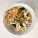 Delicious handmade noodles served with prawns, vegetables, and flavorful broth.