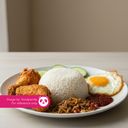 Fried chicken wings, egg, cucumber, Ikan bilis & peanuts with coconut steamed rice