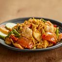 A stir-fried fluffy golden fried rice with a savoury sweet sauce with fresh seafood