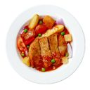 Han's signature hainanese dish. Pork chop slices topped with speciality hainanese tomato sauce. Served with rice