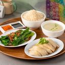 一人份鸡,油饭,耗油芥兰,鸡汤1 pax chicken; Oil Rice; Oyster Sauce Kailan; Chicken Soup
