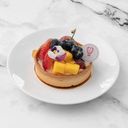 A sweet pastry filled with creamy custard and topped with fresh, colorful fruits.