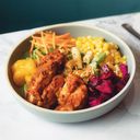 (Spicy). Teriyaki Chicken Thigh, Red Rice, Charred Miso Baby Corn, Broccoli, Romaine Lettuce, Chopped Peanuts, Housemade Vegan Carrot Pineapple Kimchi, Cherry Tomatoes, Cucumber, Coriander, Kaffir Lime Aioli