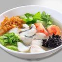 Delicious noodle soup with tender fish slices and thick rice vermicelli in savory broth.