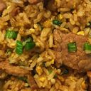 Wok-tossed egg fried rice, with onion, and sping onions topped with juicy beef slices