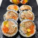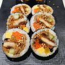 Fried chicken gimbab filled with Carrots, Pickled radish, Cucumber, Pork Sausage, Fish Cake, Omelette. Made more flavorful with yangneom chicken sauce.
